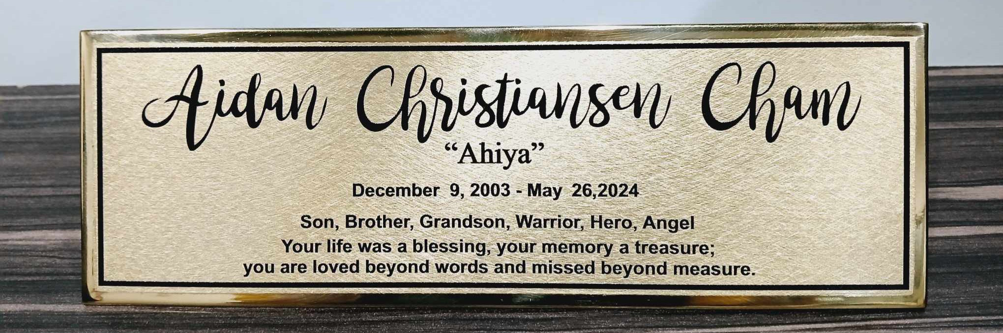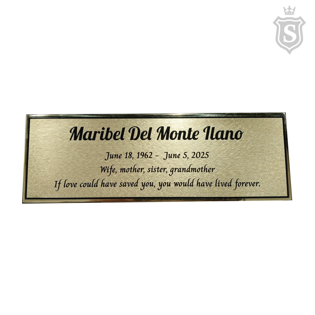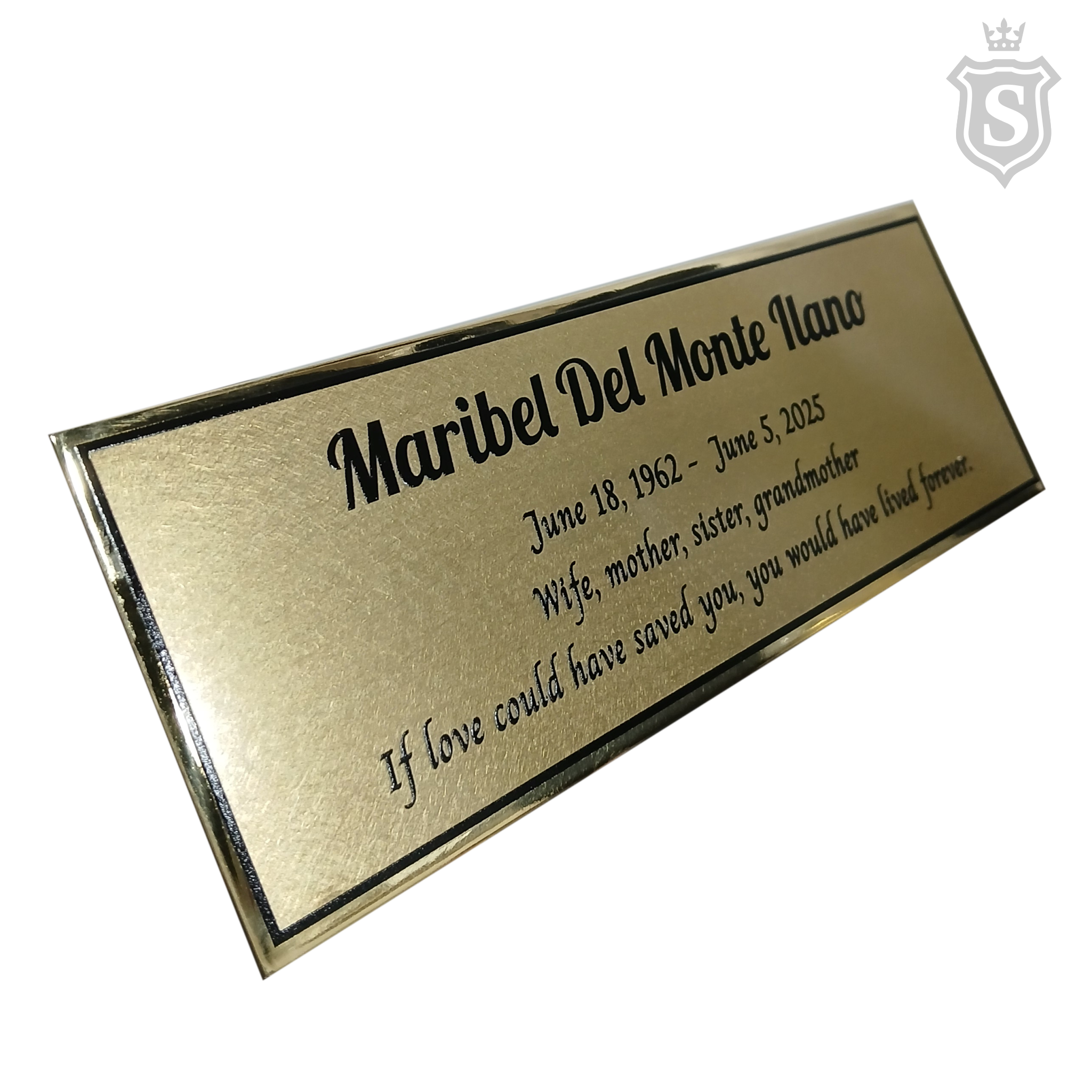 Material/Finish: | Premium Brass Plate, Brushed gold finish with polished border, UV Printed black text |