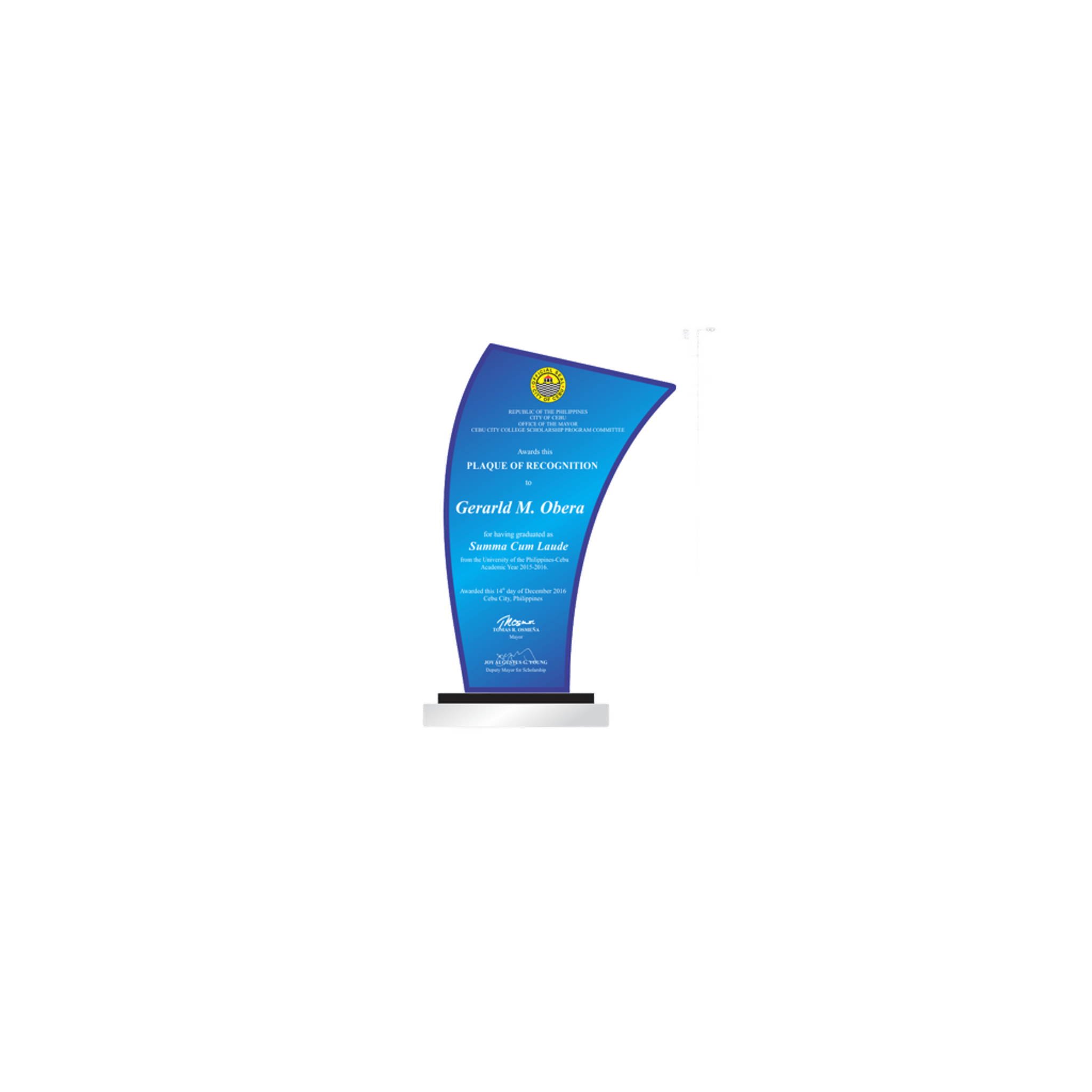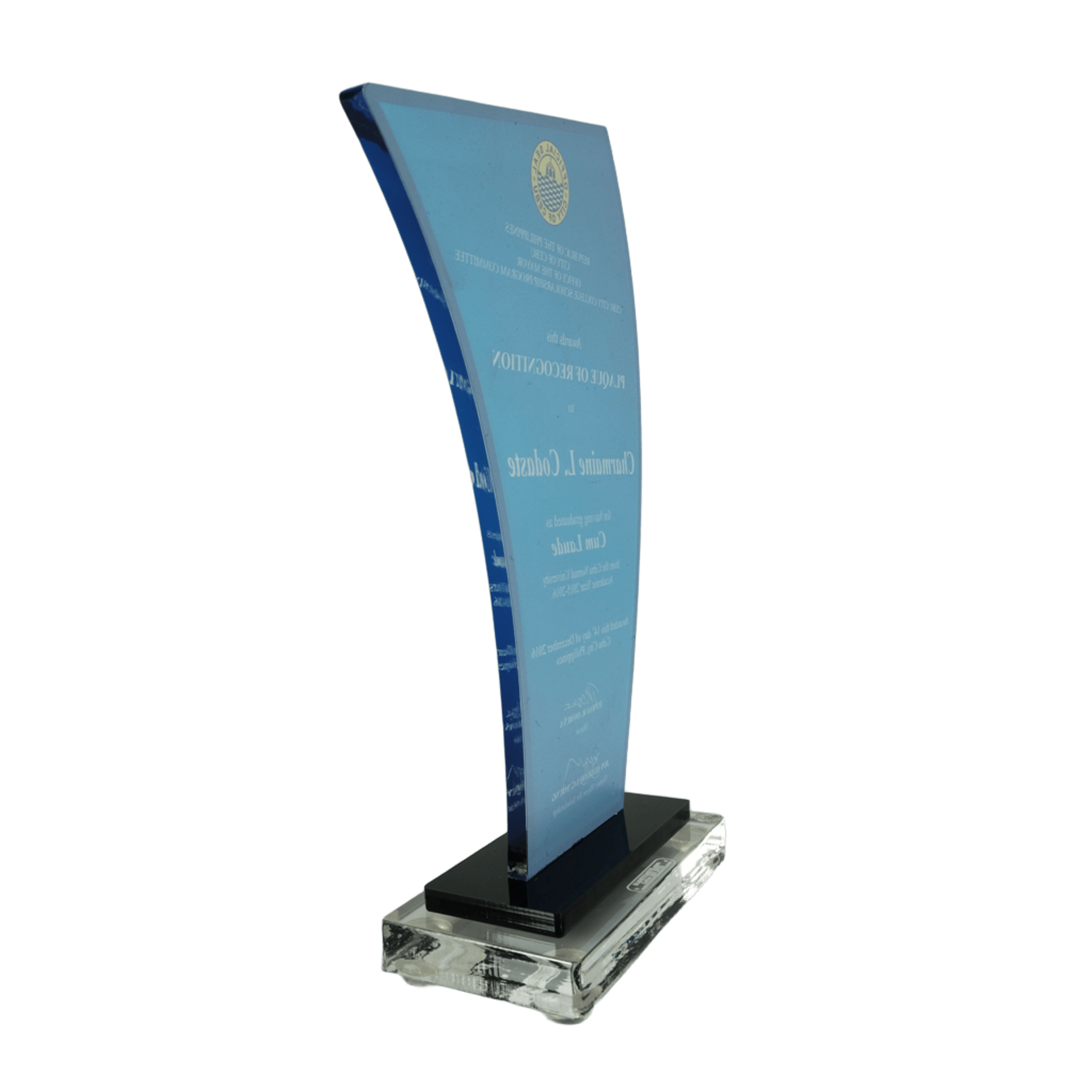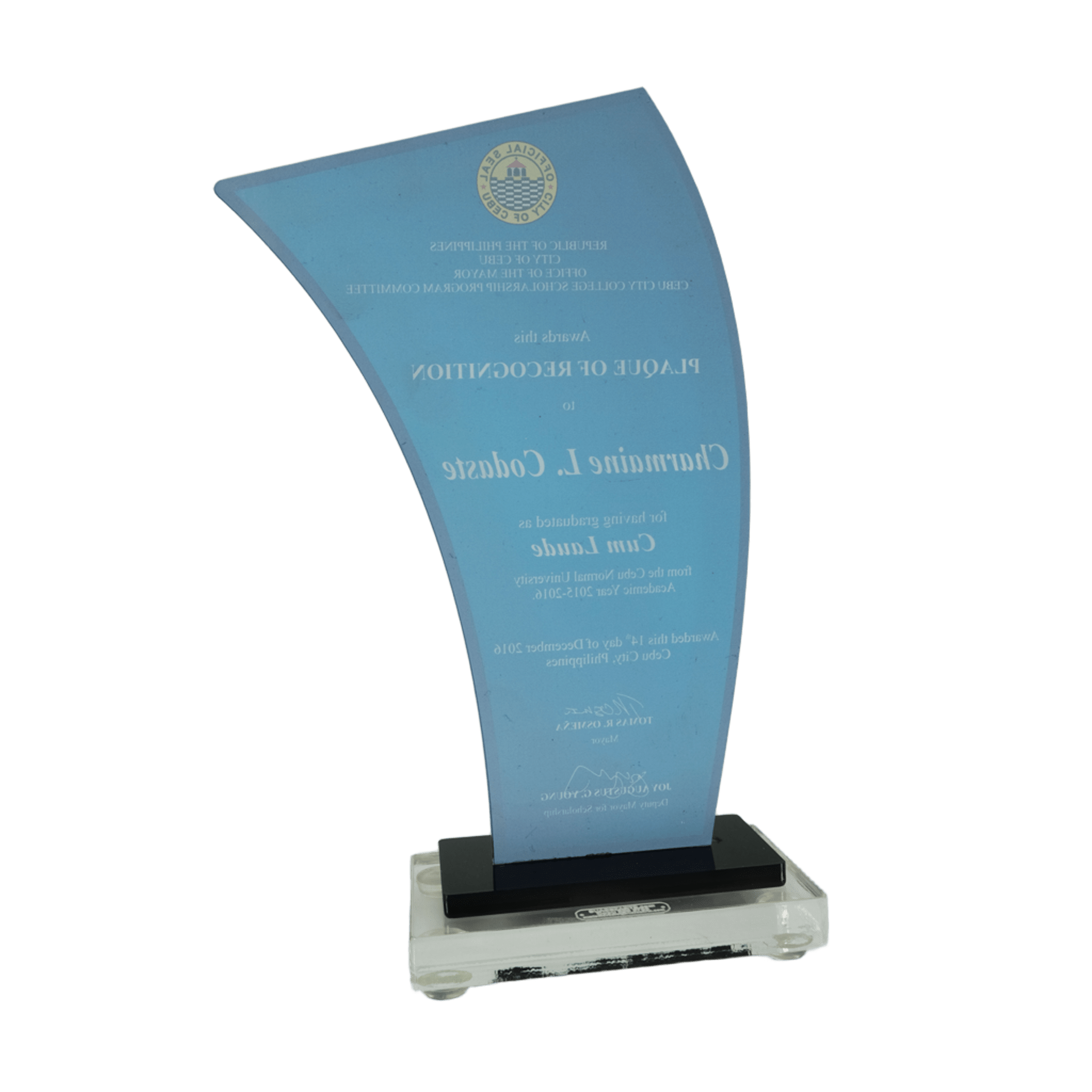 Material/Finish: | Clear Acrylic with UV Printed Text and Gradient Design, Clear Acrylic Base with Black Acrylic Accent |