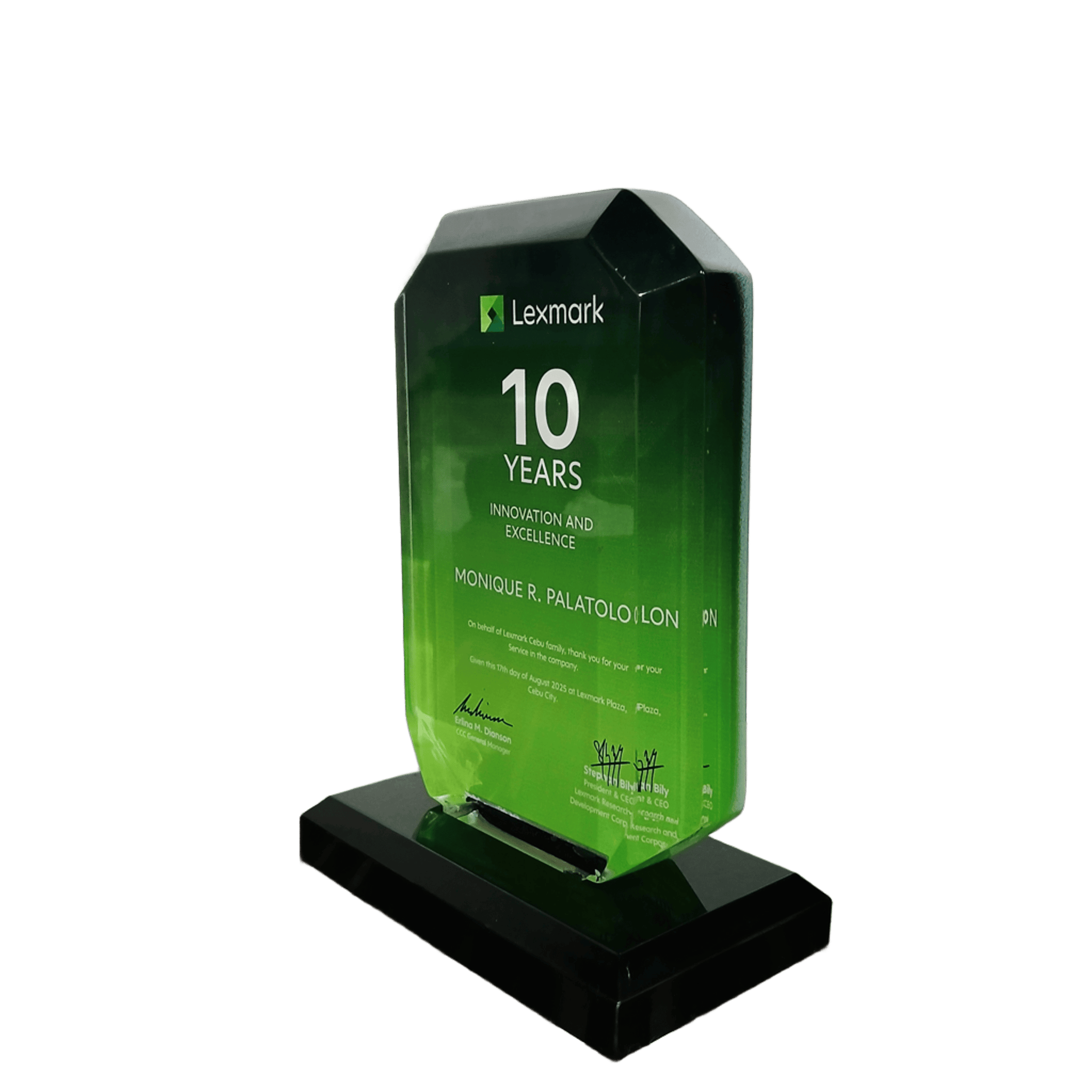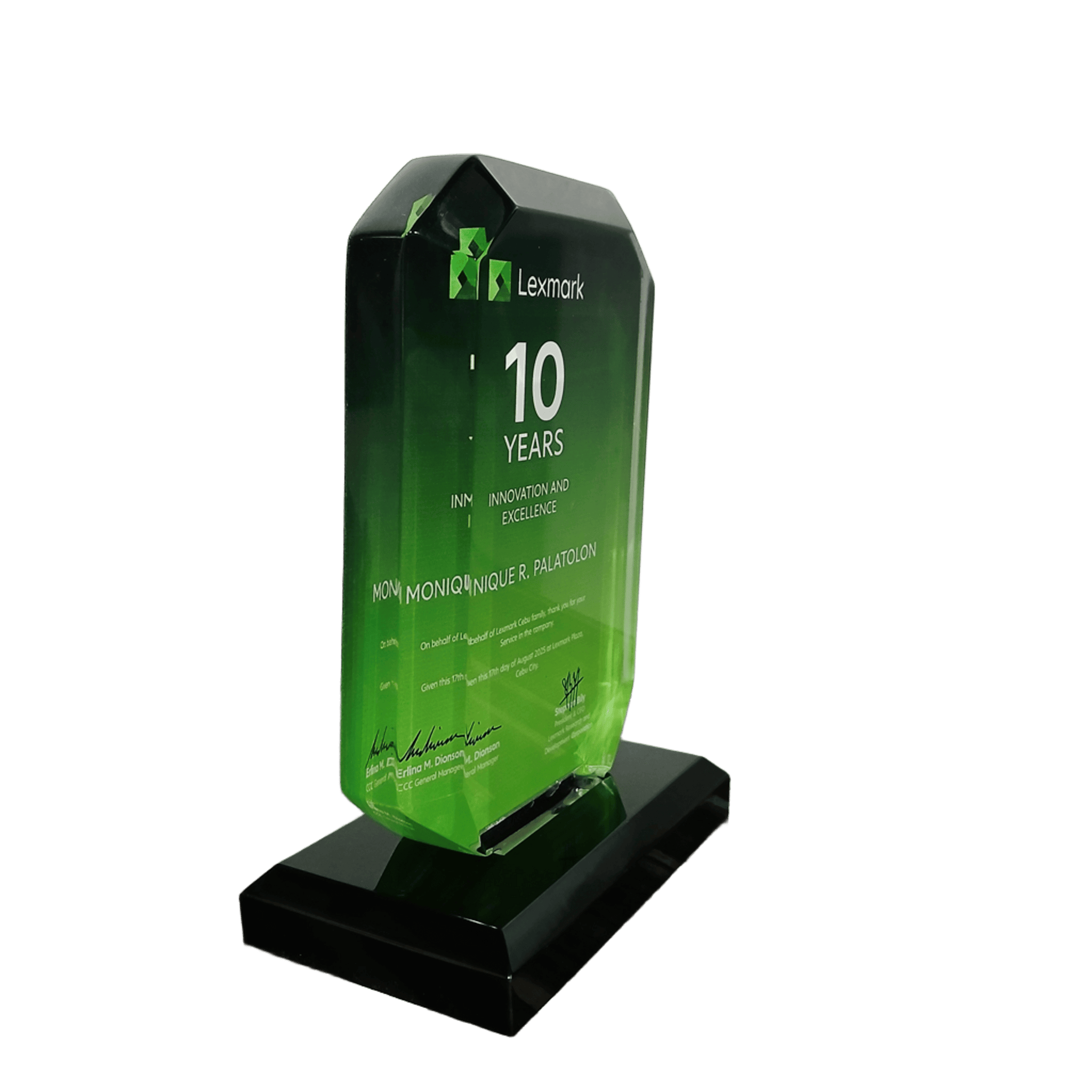 Personalization Area: Entire front surface + base, UV print on acrylic, Company/Org logos, Event name, date, and award details