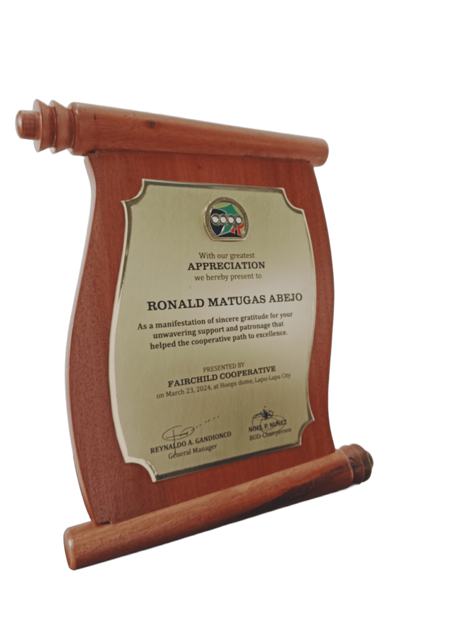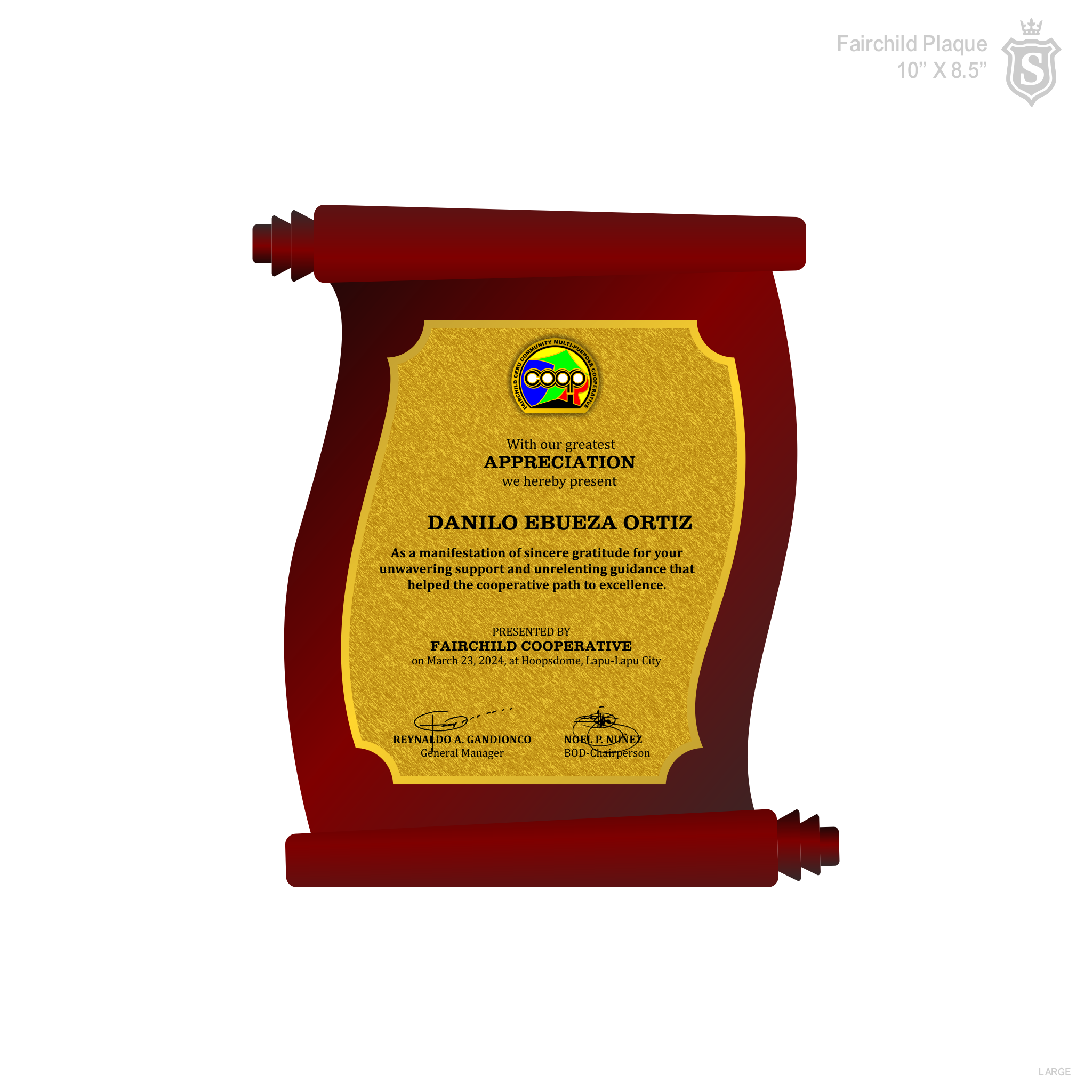 | Production Style: | Scroll-shaped wooden base for a prestigious look. Custom engraved edge cut brass plate with rounded decorative corners. Full-color logo on top, multi-font text layout for highlighted names/titles |