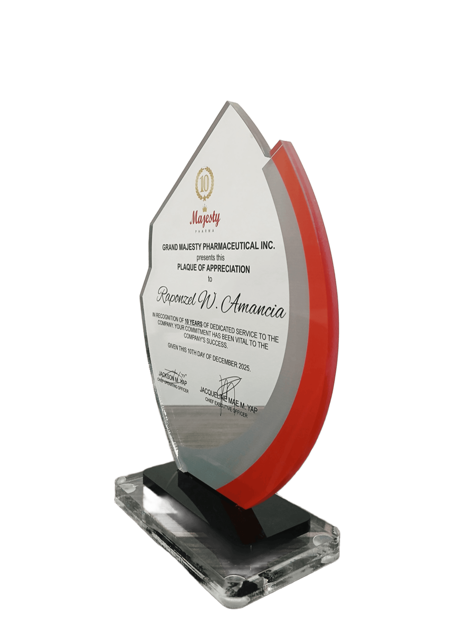 | Personalization Area: | UV-printed text and full-color design (logo, “Majesty Pharma,” award details, year) on the face of the acrylic |