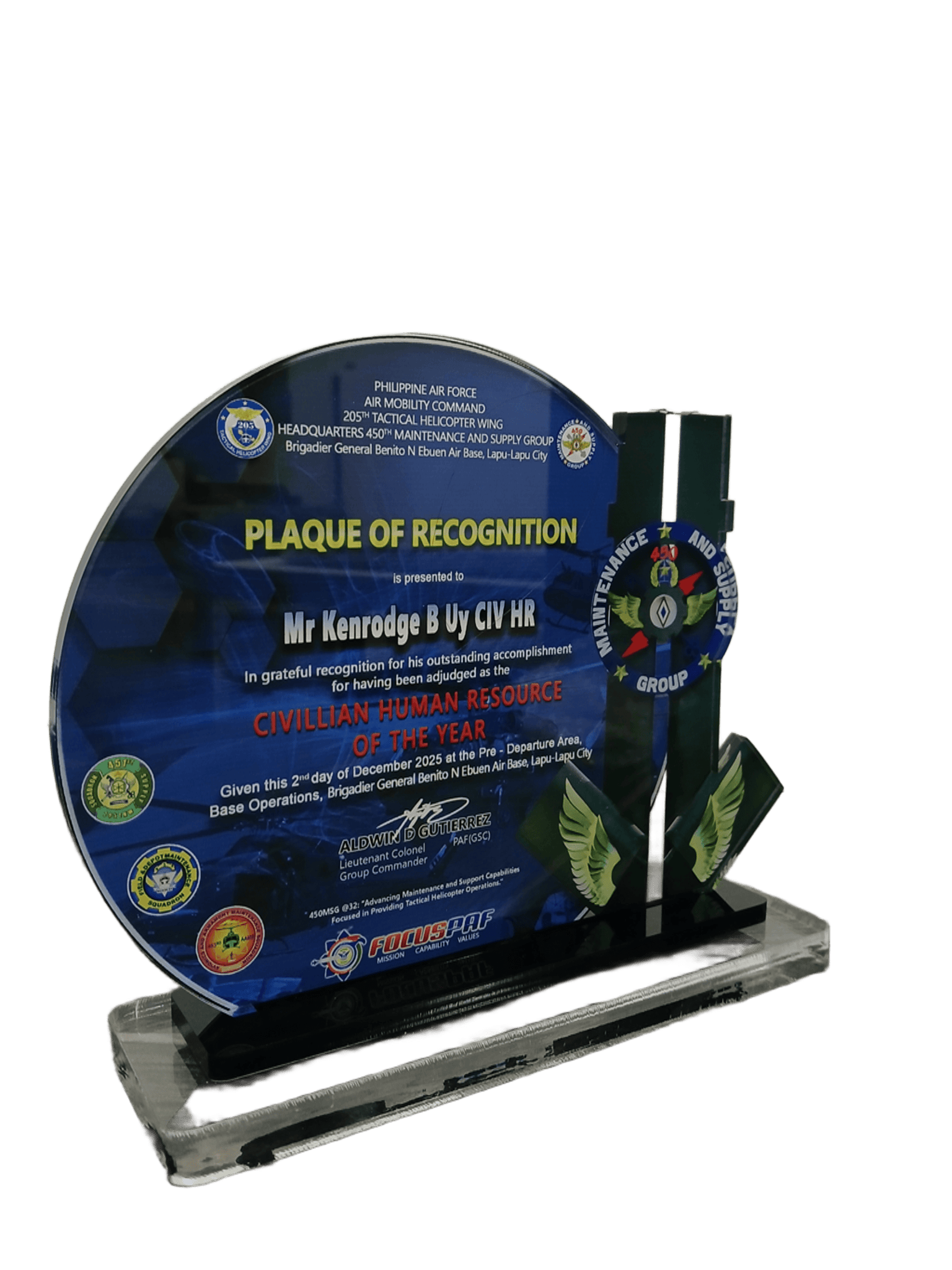 Philippine Air Force Air Mobility Command 205th Tactical Helicopter Wing Headquarters 450th Maintenance and Supply Group - Plaque of Recognition