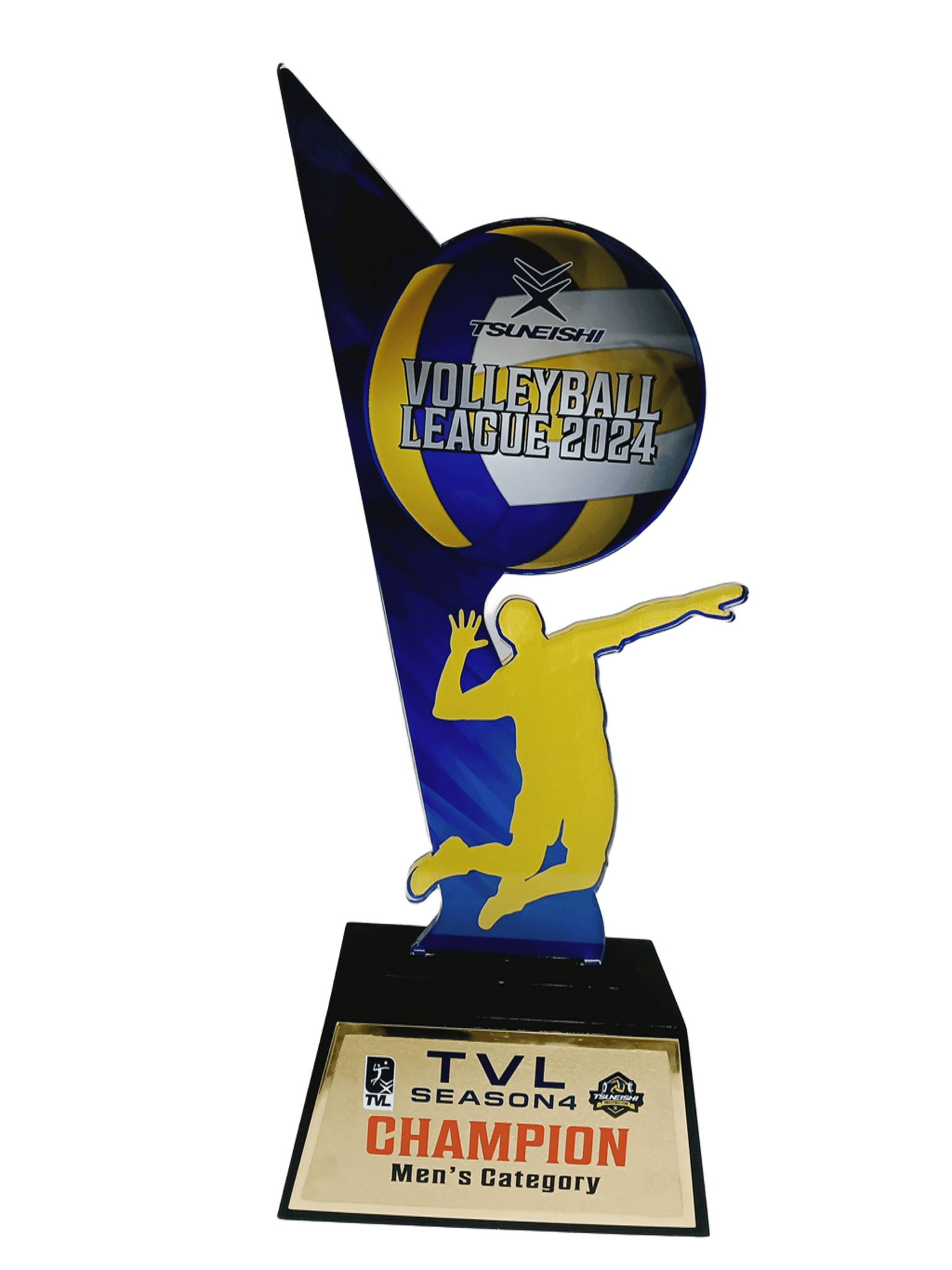 Acrylic Material UV printed full-color design (volleyball graphic, league text, and logo) Solid wooden base, rectangular cut, smooth finish |