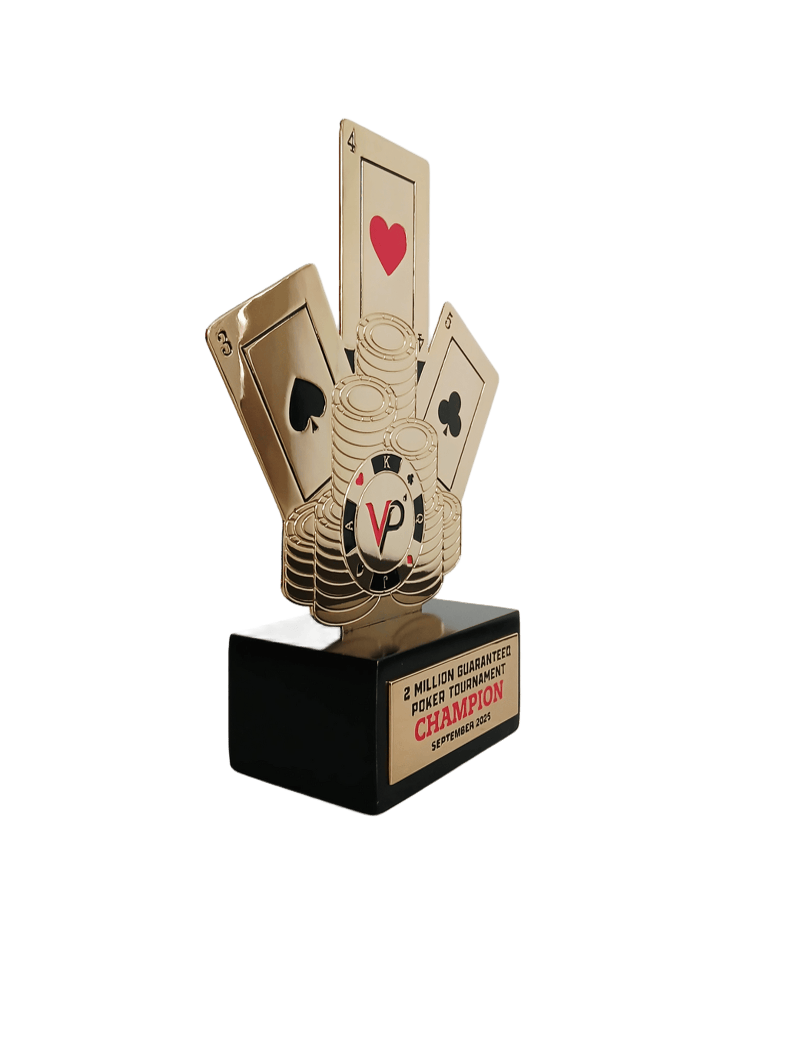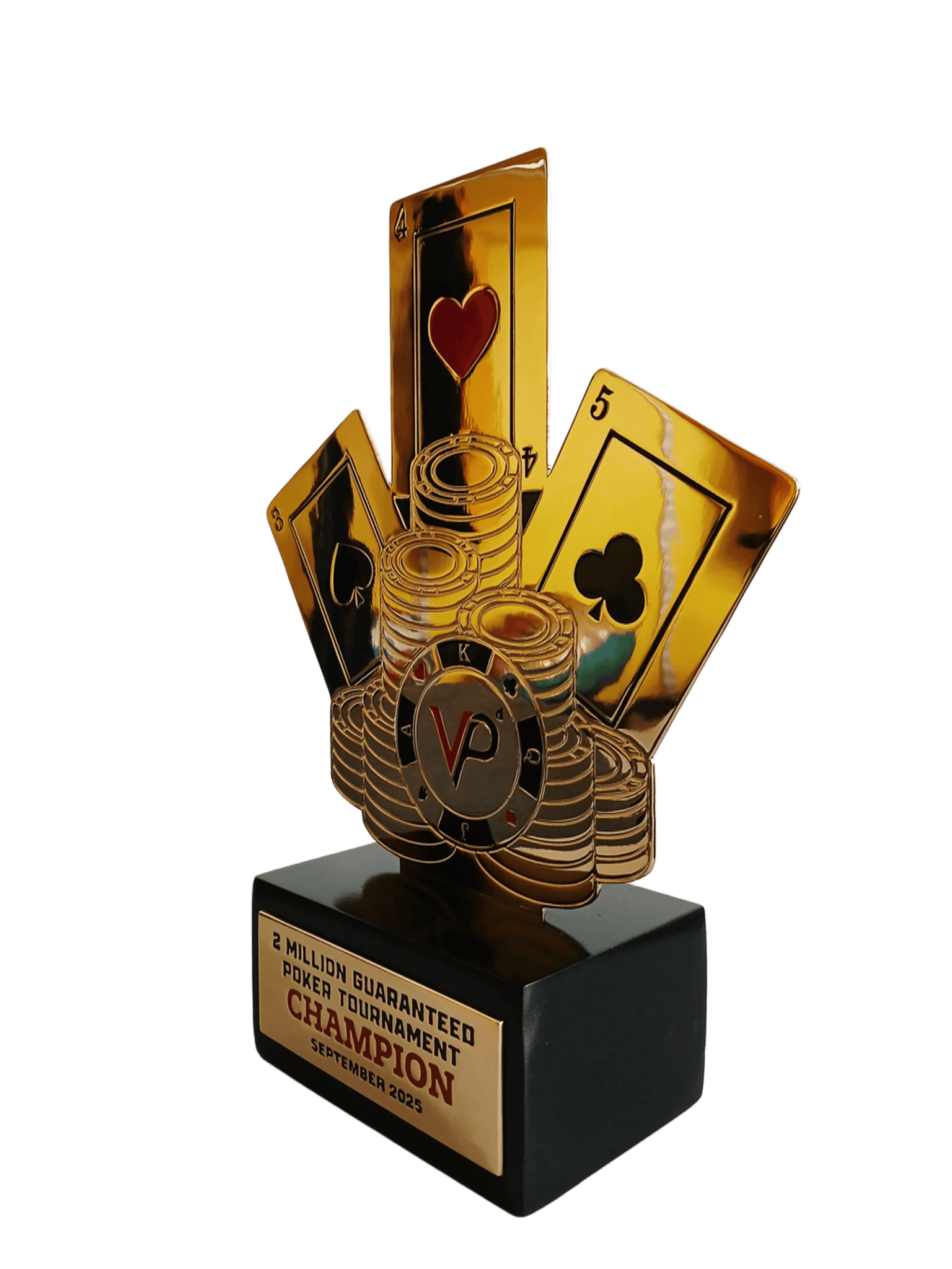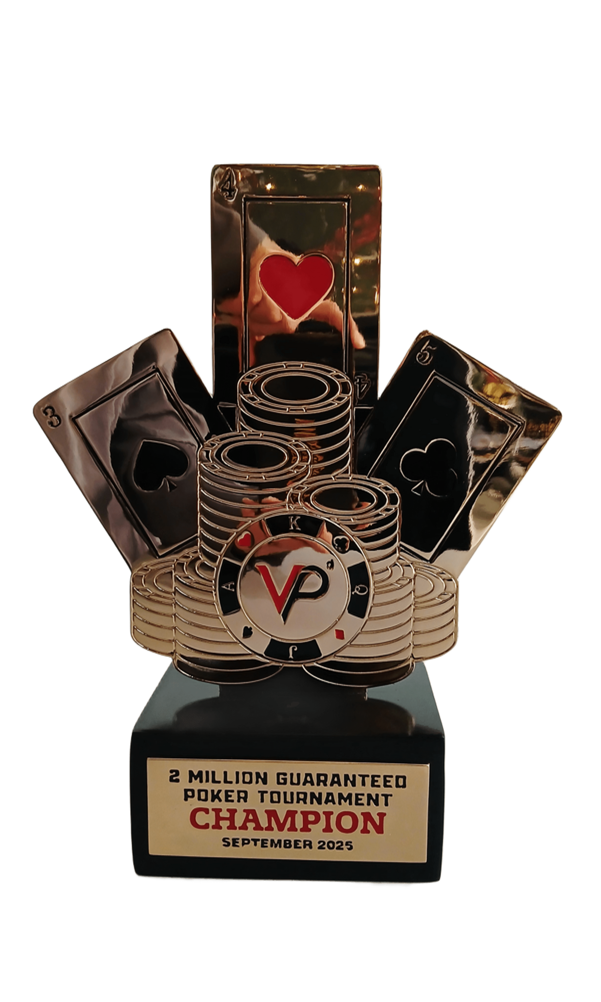 Artwork: | Poker card symbols (3, 4, 5). Poker chips with VP logo. Text: “2 Million Guaranteed Poker Tournament Champion — September 2025”. |