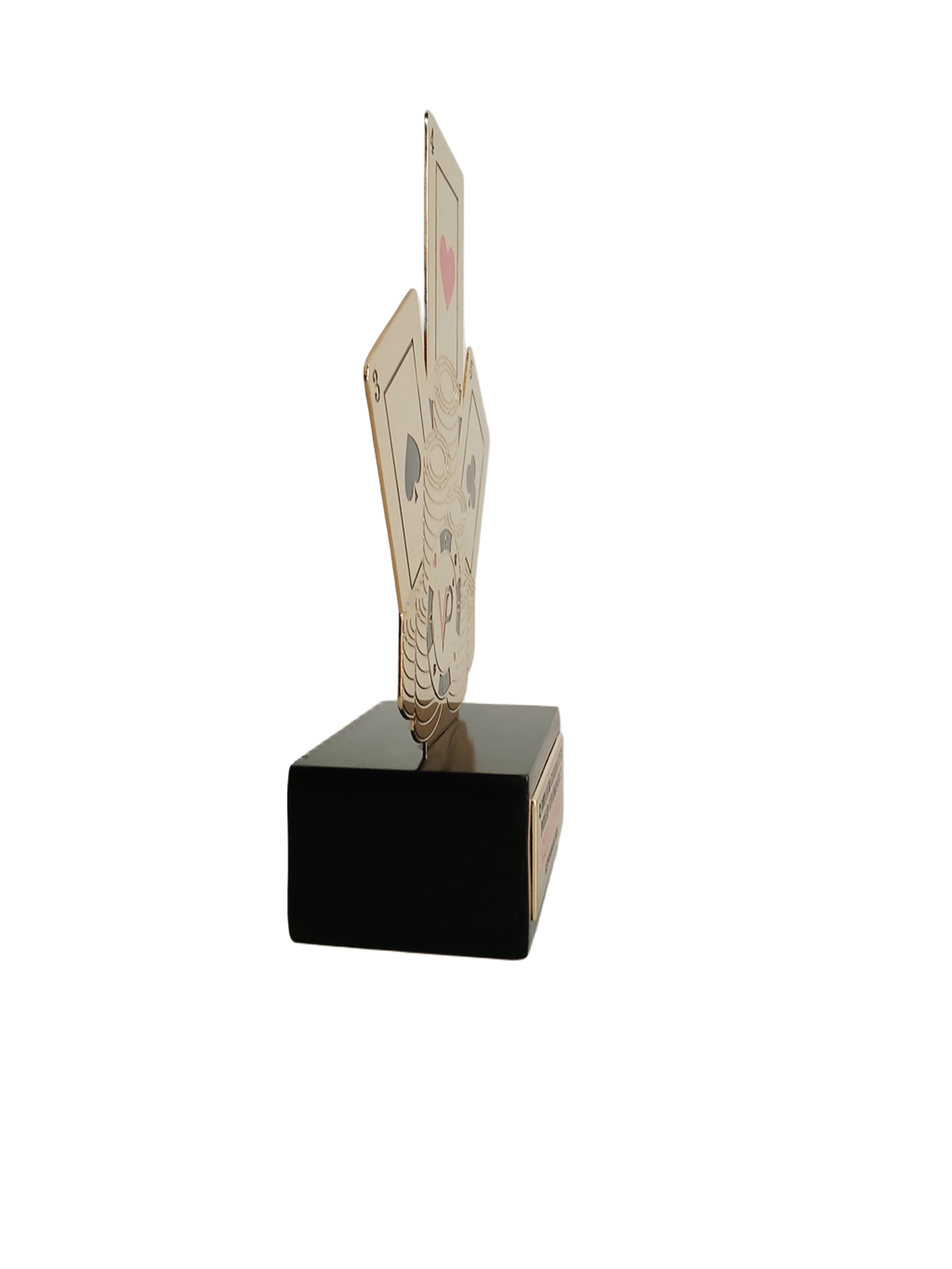 Personalization Area: | CNC engraved text and design on brass. Painted details on etched areas (suits, logo, lettering). Champion details engraved on brass base plate. |