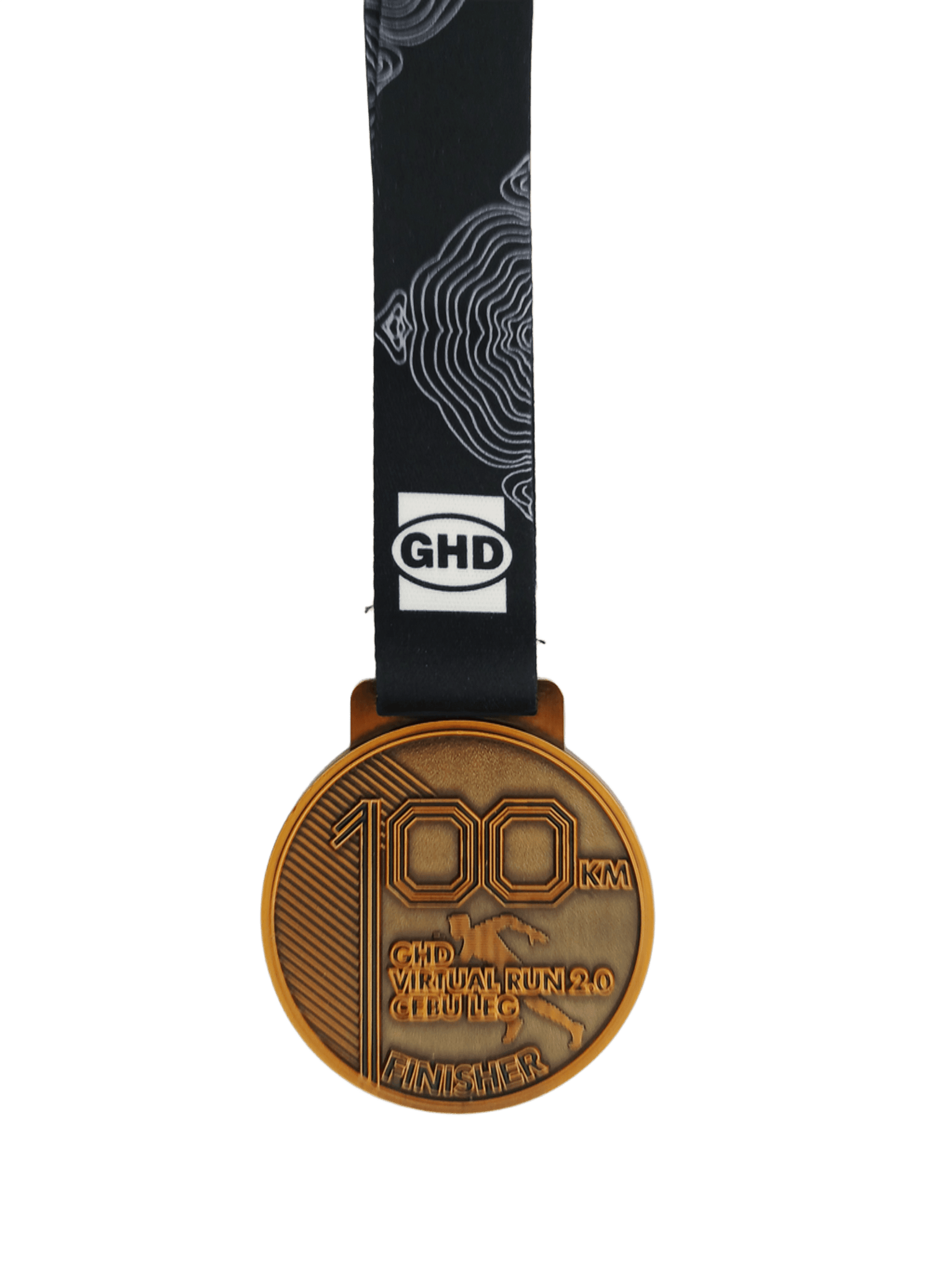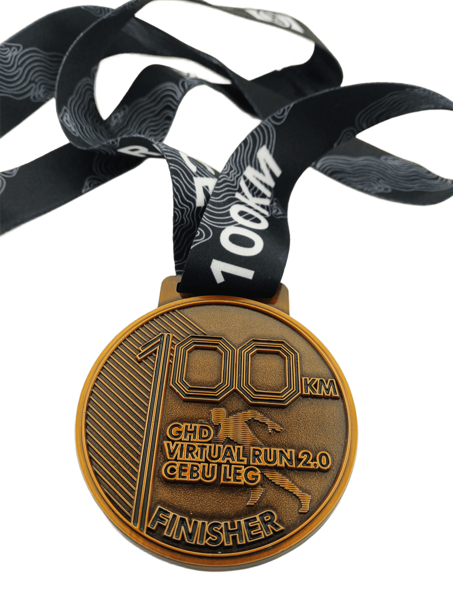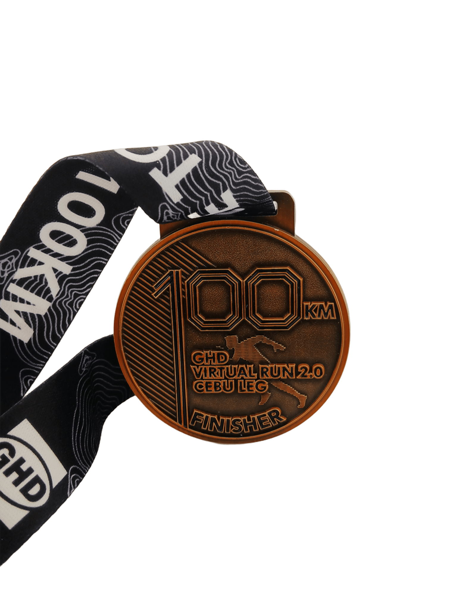Center seal and custom logo (Check mold charges) Raised “100 KM Finisher” text, GHD Virtual Run 2.0 Cebu Leg logo, embossed runner figure |