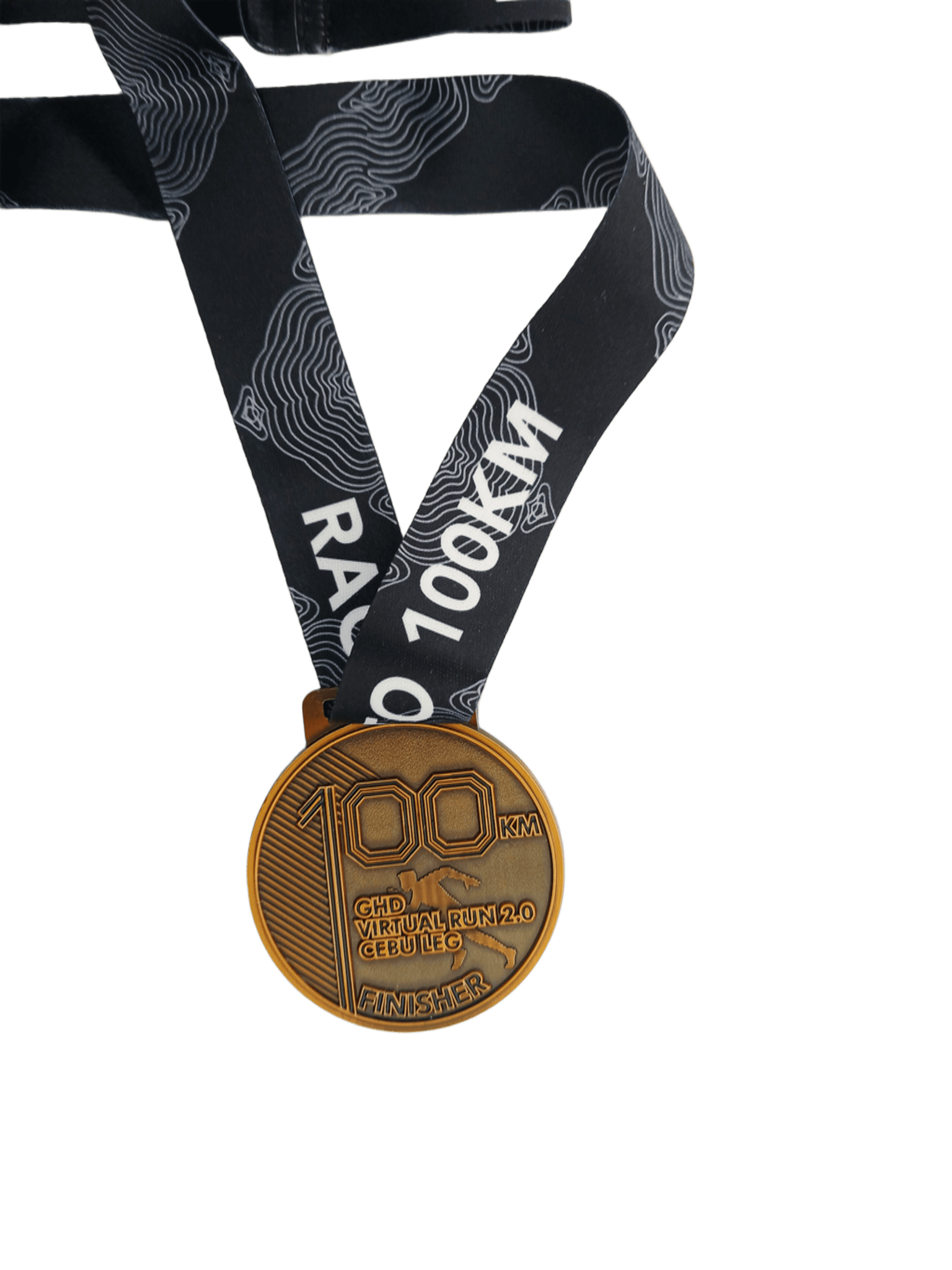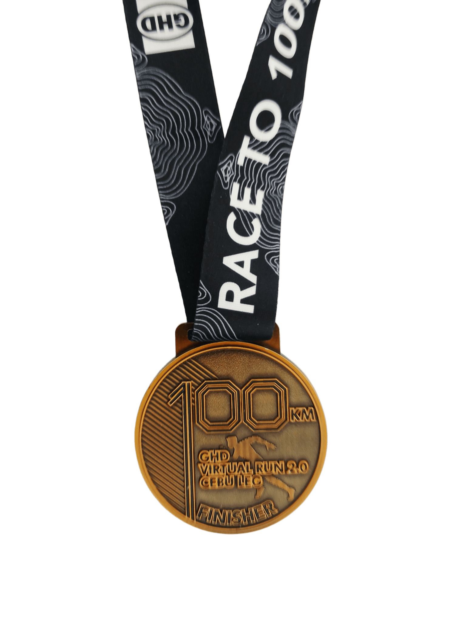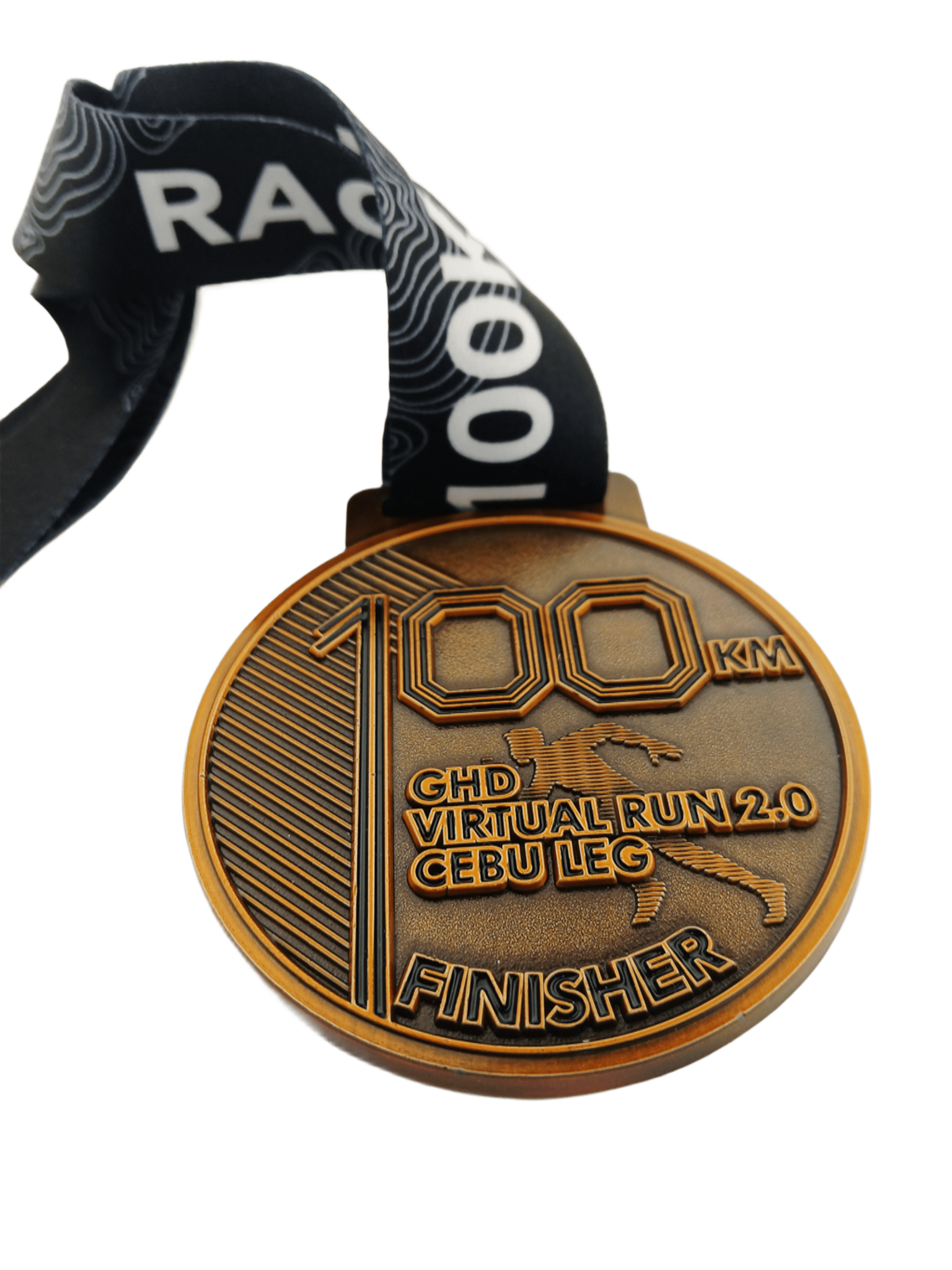 Center seal and custom logo (Check mold charges) Raised “100 KM Finisher” text, GHD Virtual Run 2.0 Cebu Leg logo, embossed runner figure |