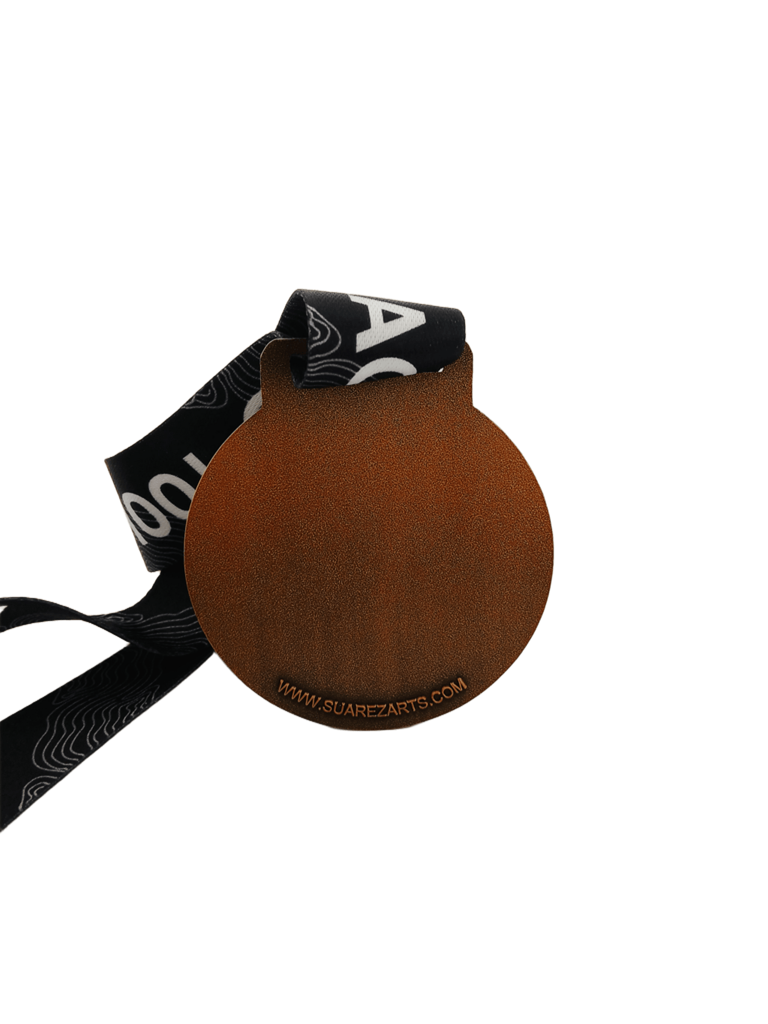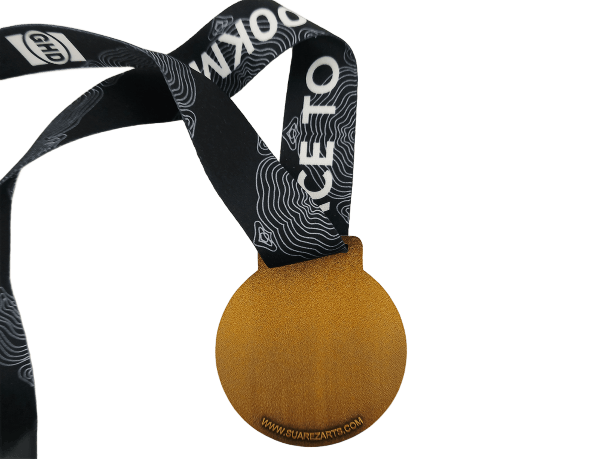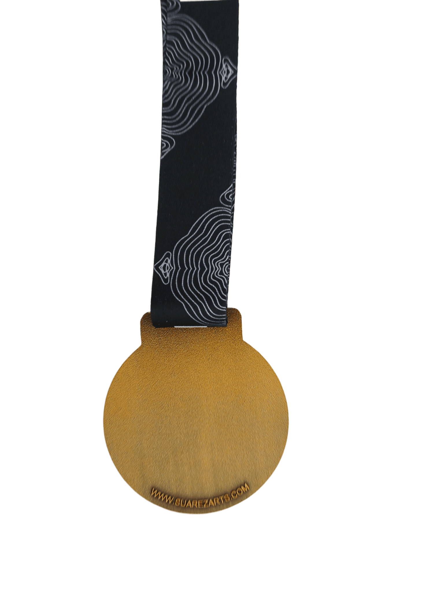 Fixed ribbon loop cast into the medal’s top for strength 38 mm-wide sublimated fabric ribbon, black with white printed “100 KM” and topographic line patterns |