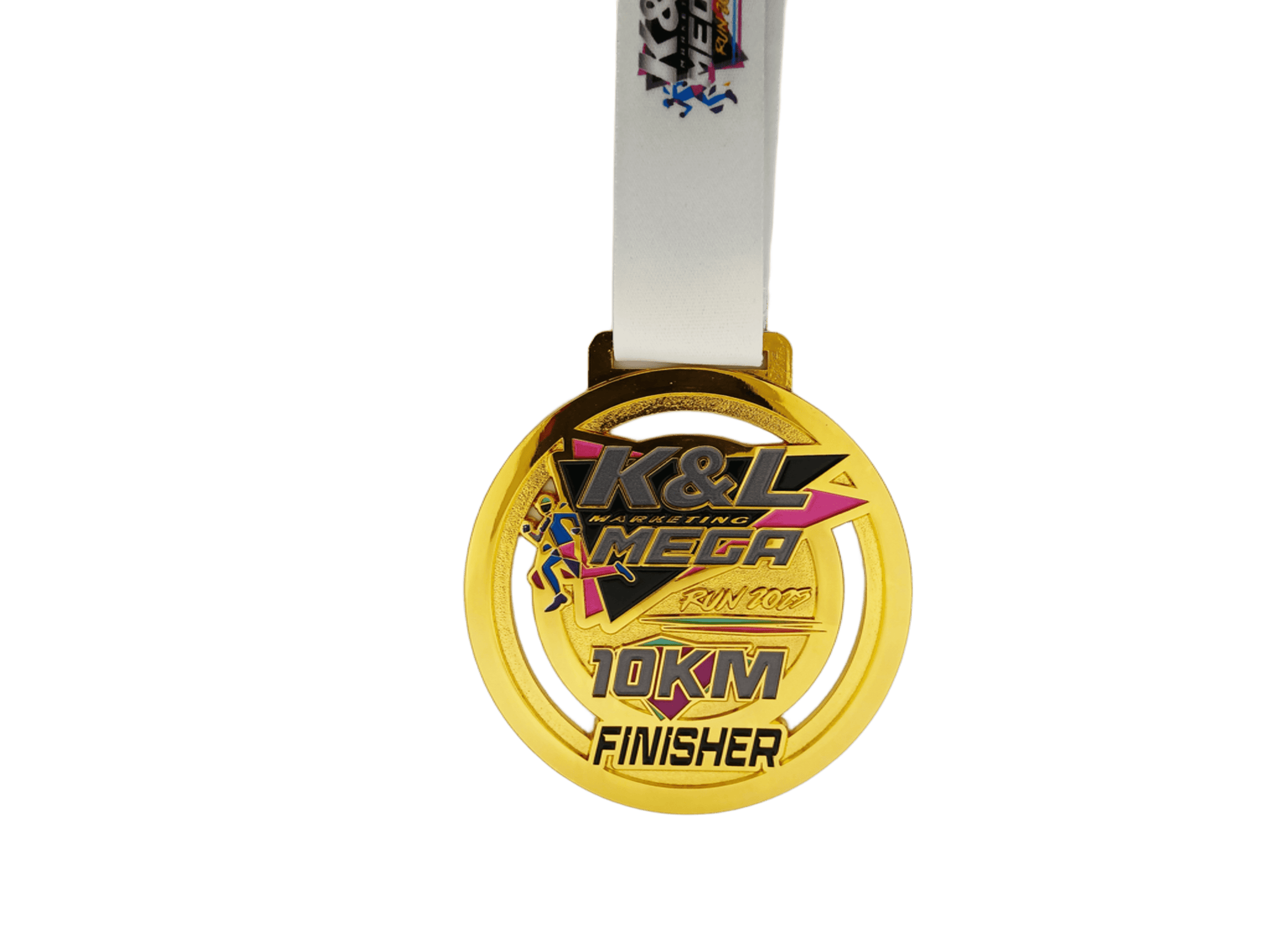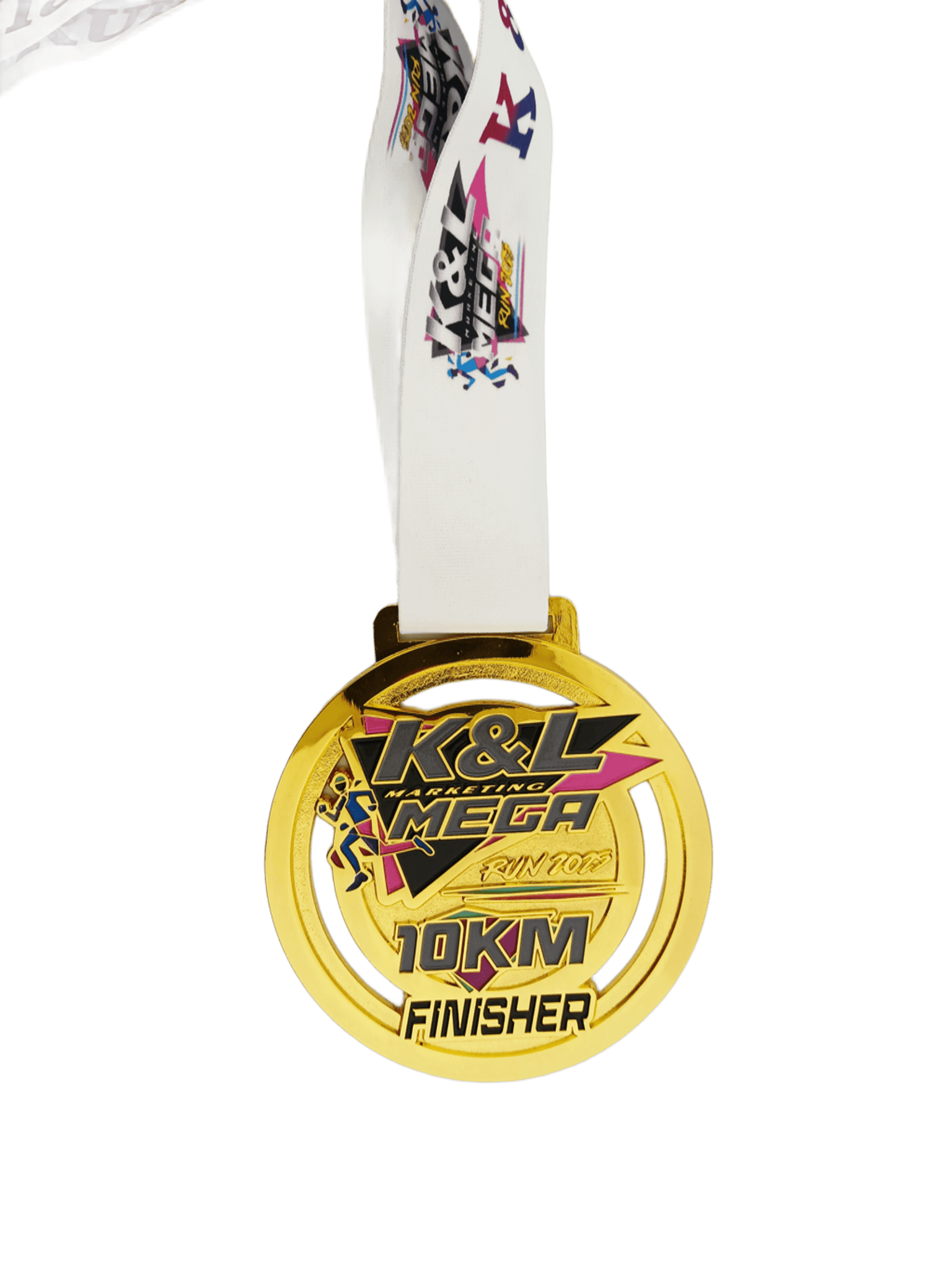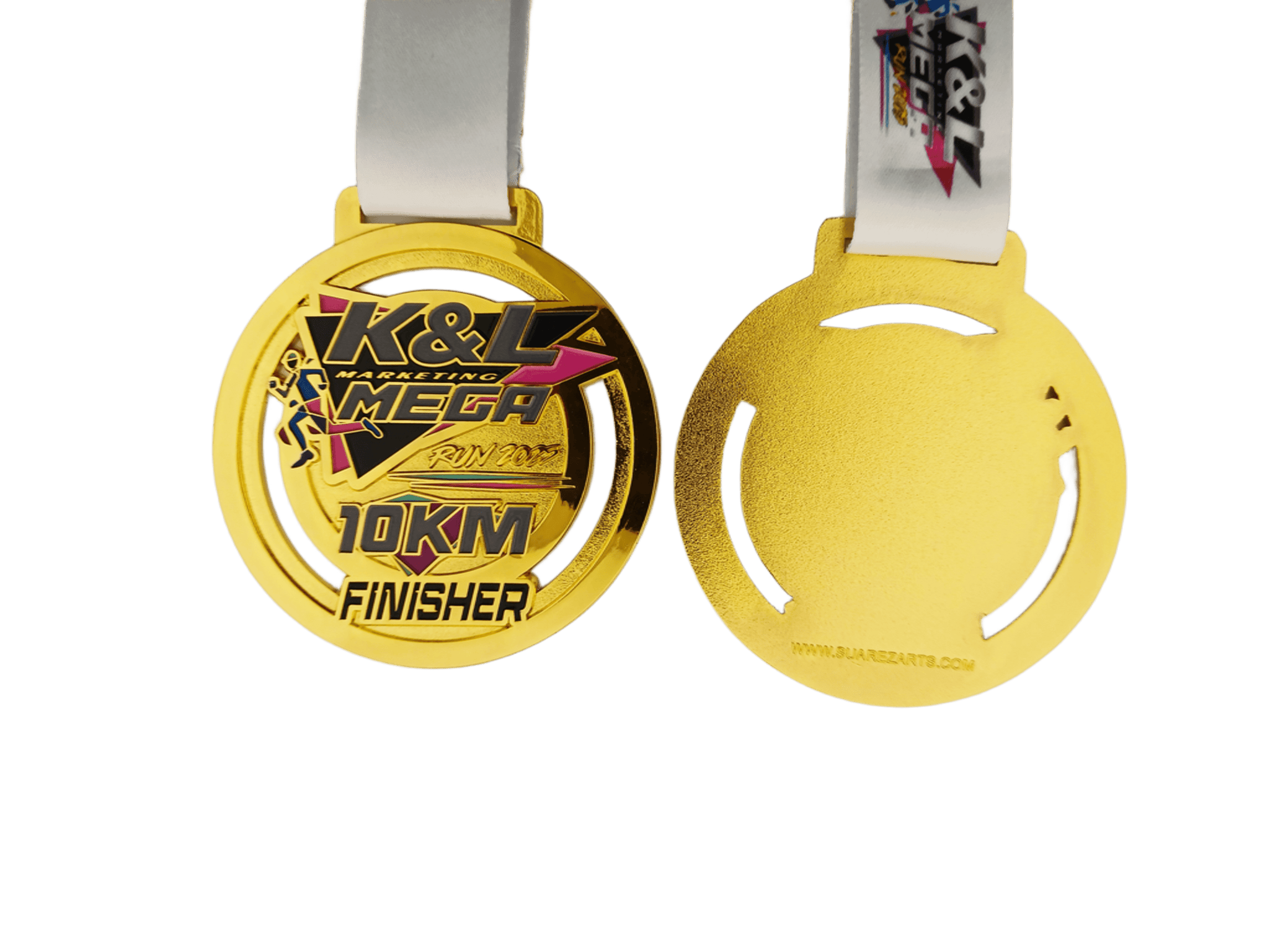 Front: Multicolor embossed design with event logo, text ''10KM Finisher,'' and runner graphic Back: Plain gold finish with subtle texture and website engraving (www.suarezarts.com) |