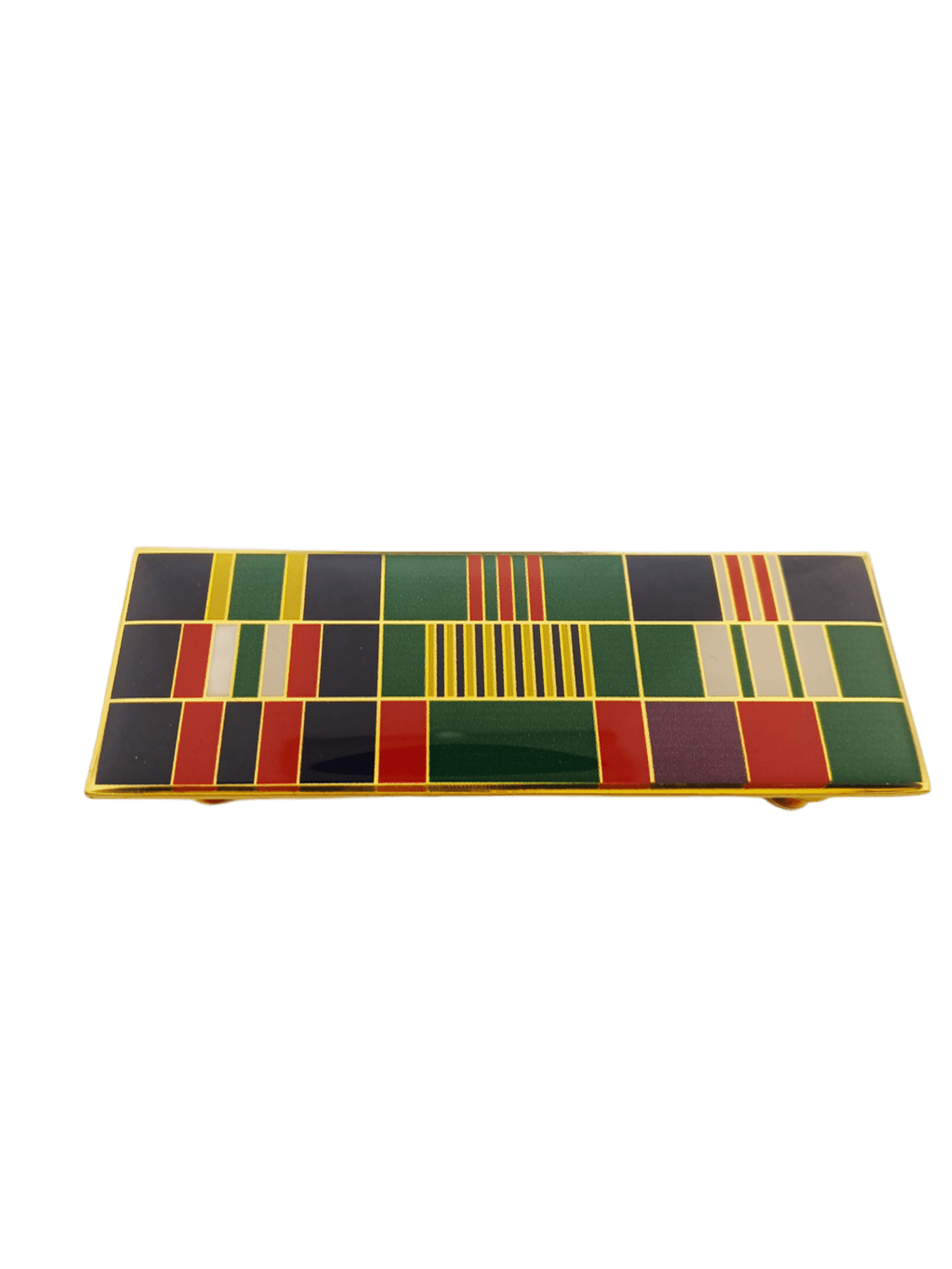 | Personalization Area: | Brass plate (gold finish) showing list of awards or rank titles; colors UV printed on metal base background; embossed attachment elements (bars, insignias) added as needed |
