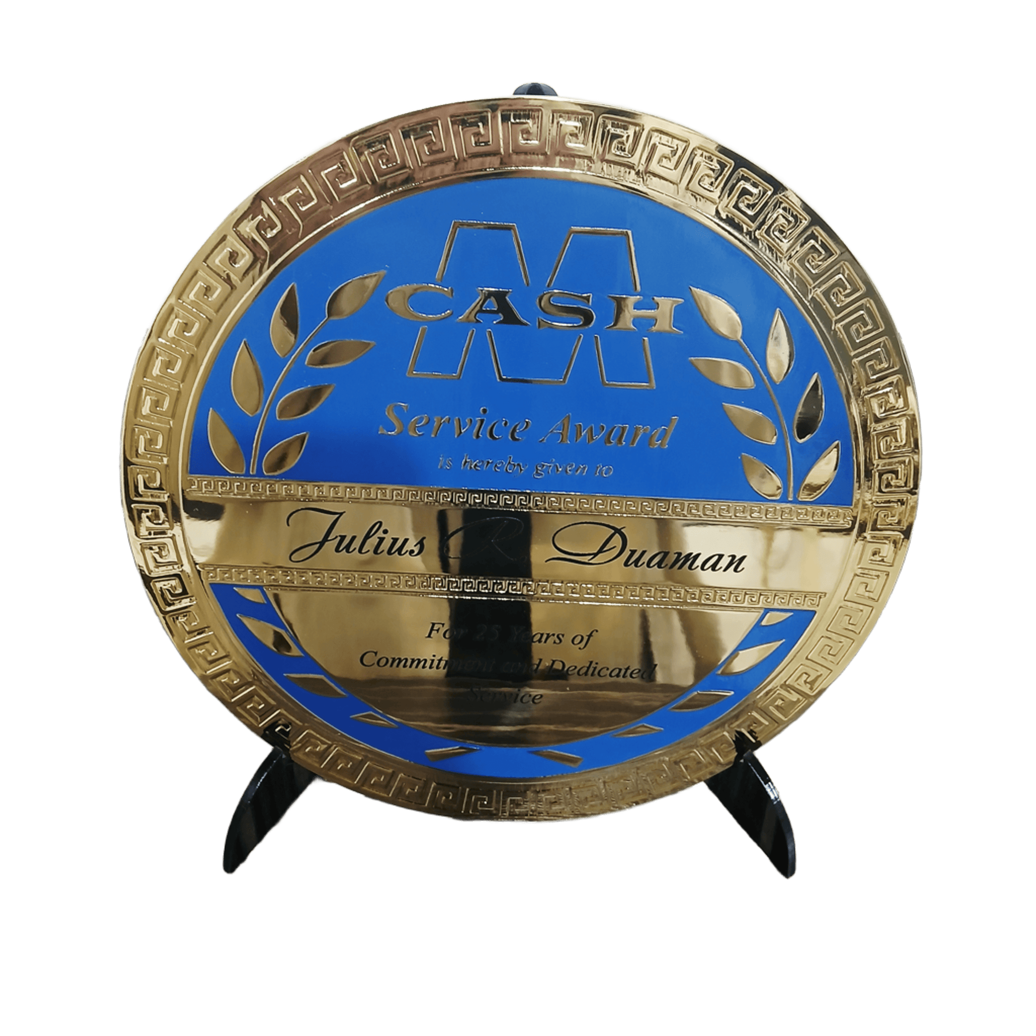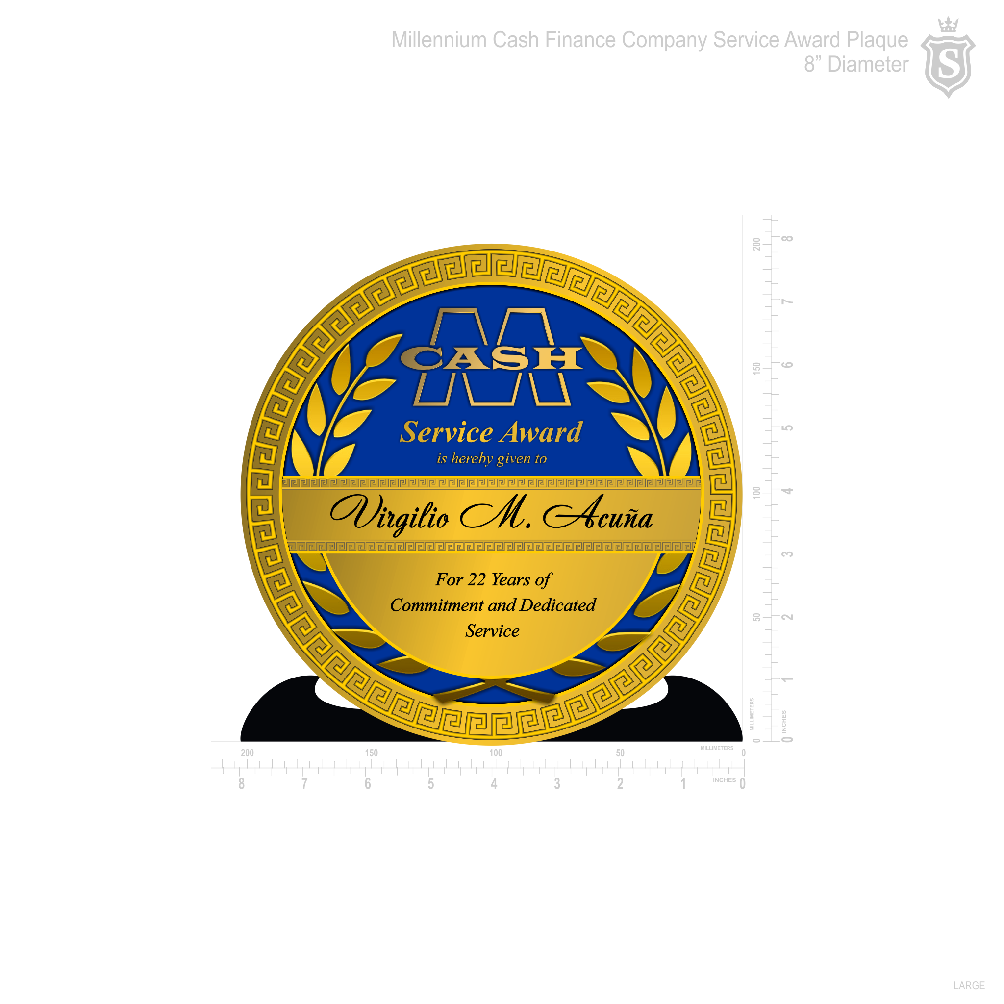 | Personalization Area: | Center seal and custom logo (Check mold charges), Fully embossed layout with detailed factory background, large “25 Years” text, and customized nameplate |
