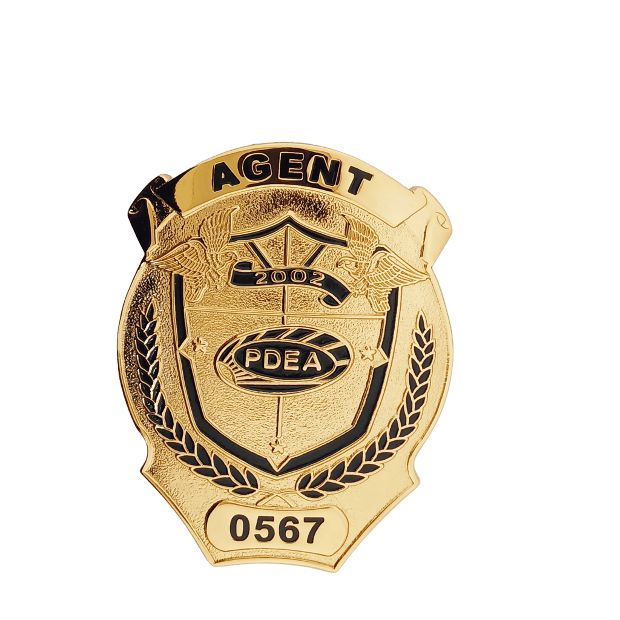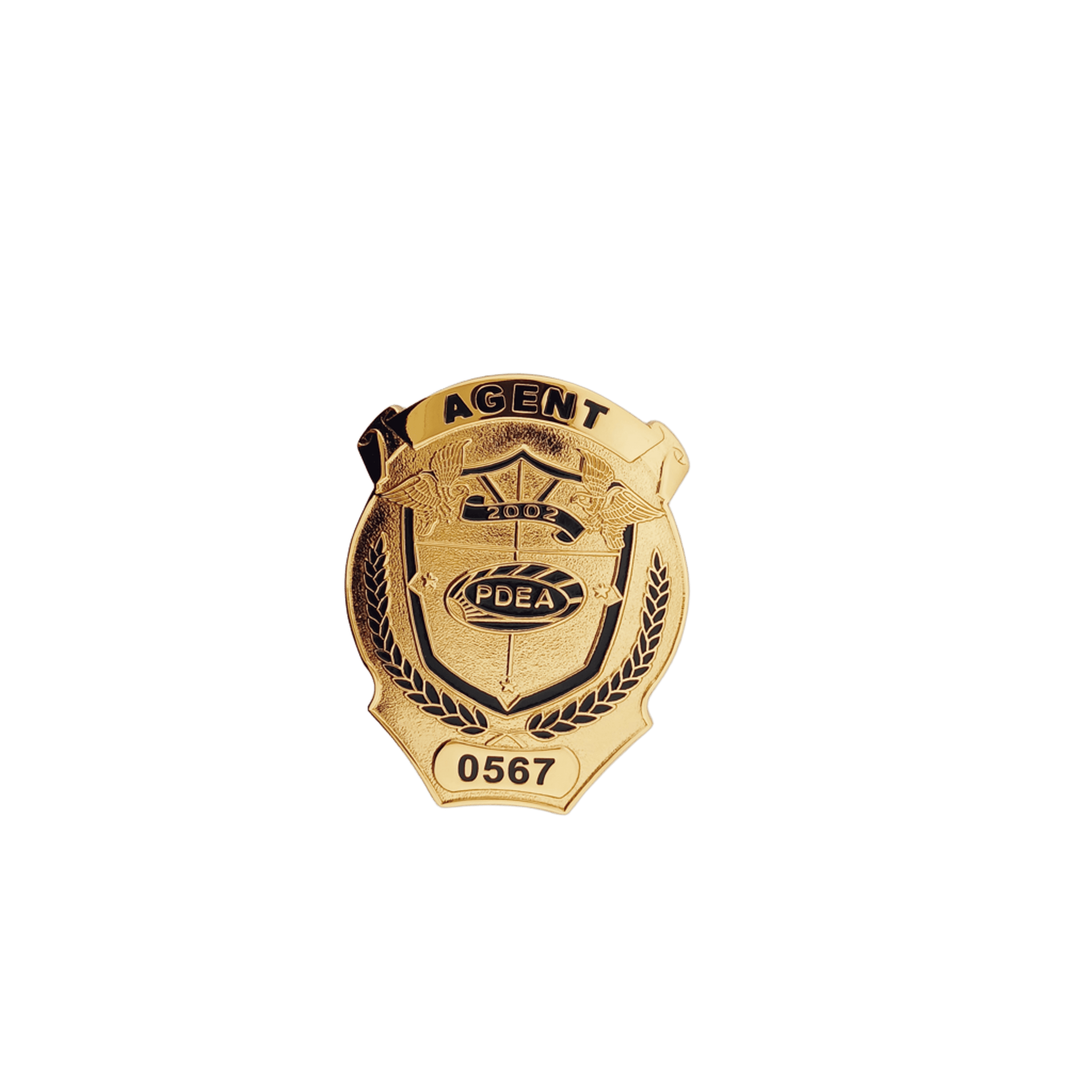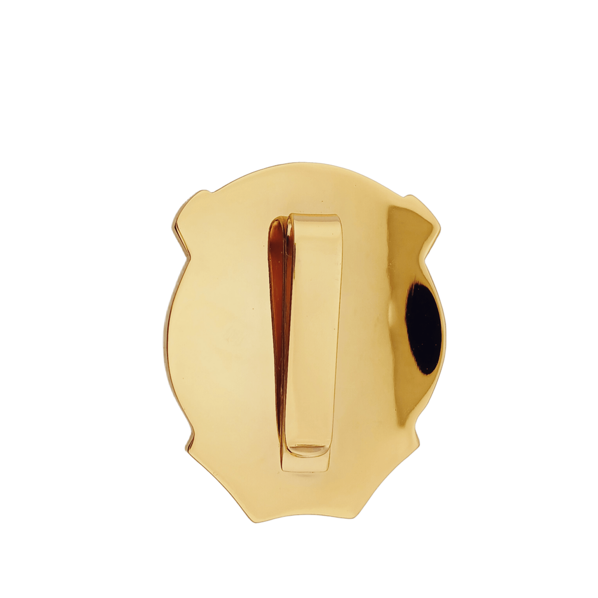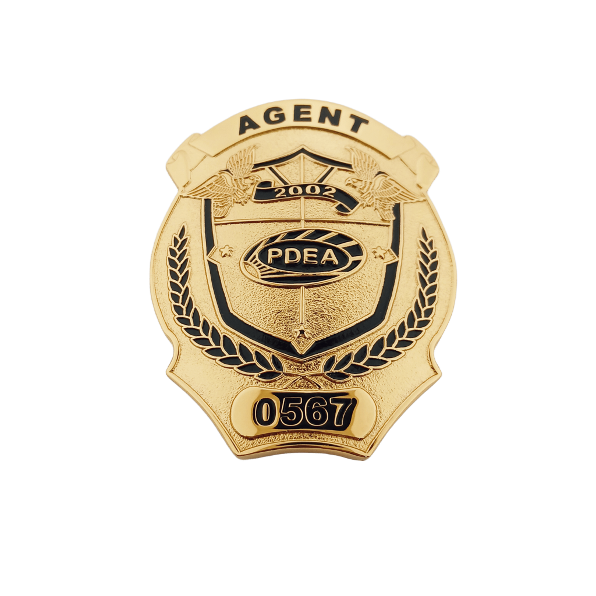 | Material/Finish: | Copper-based metal with mirror gold-plated finish; deep embossed detailing with enamel paint accents. Curved profile forming for dimensional presentation. Badge number engraved and paint-filled in black; numbering is replaceable/customizable upon request. |