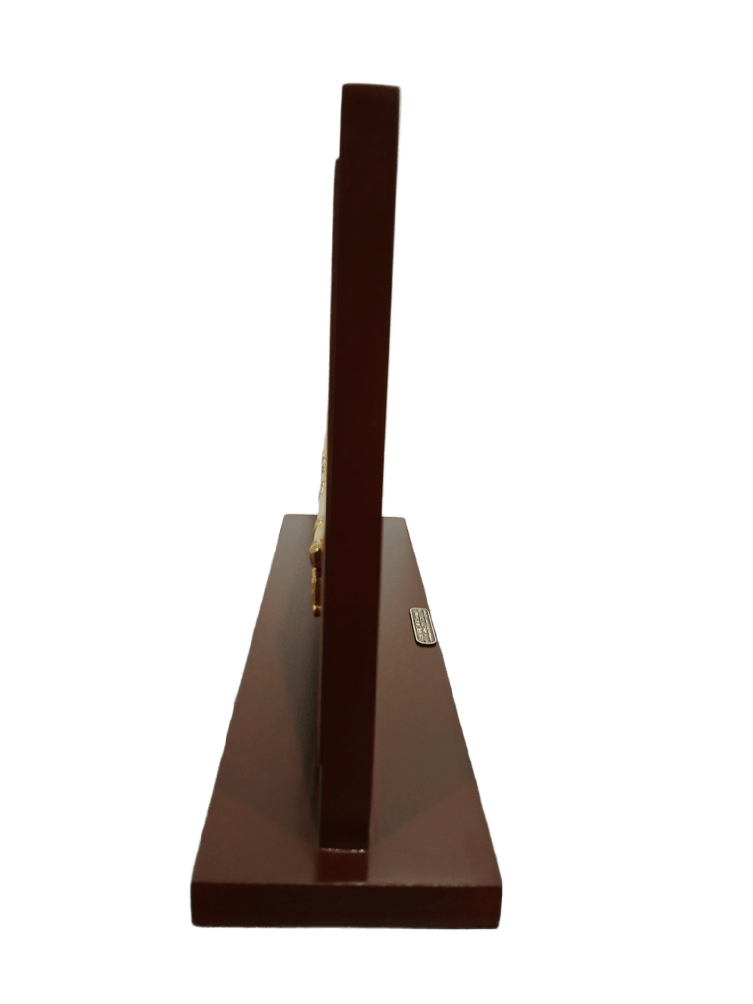 Solid wood base (painted brown, polished surface) Brass plate overlay (1.5 mm thick) Direct UV print on brass, with sanded & polished border edges |