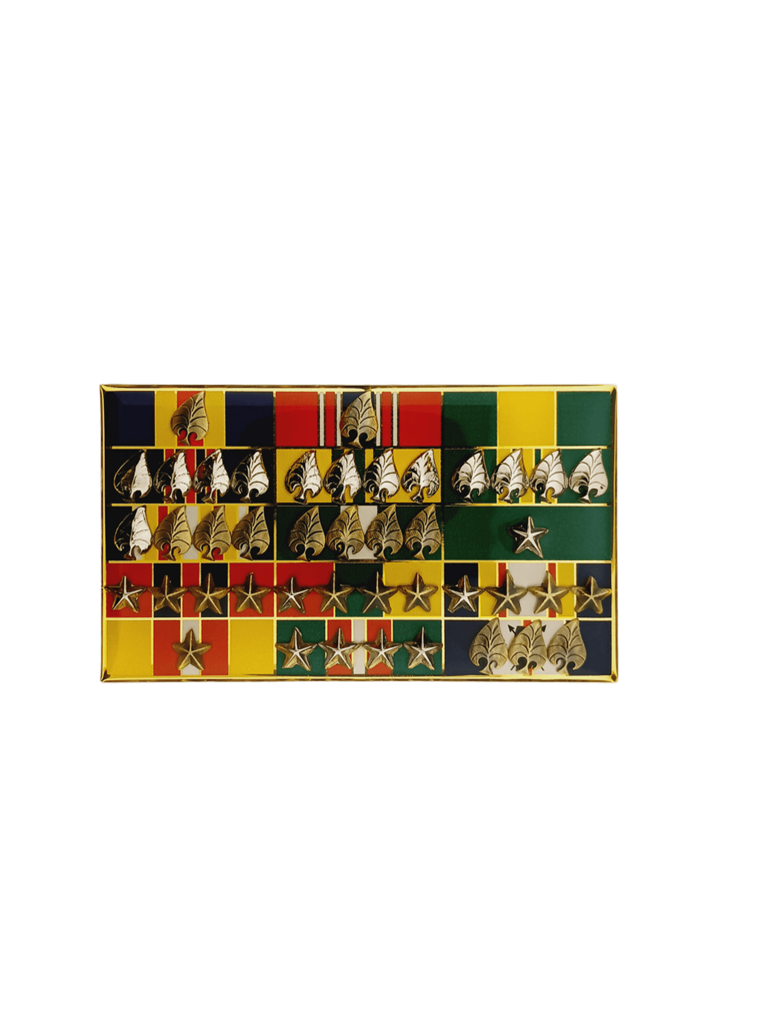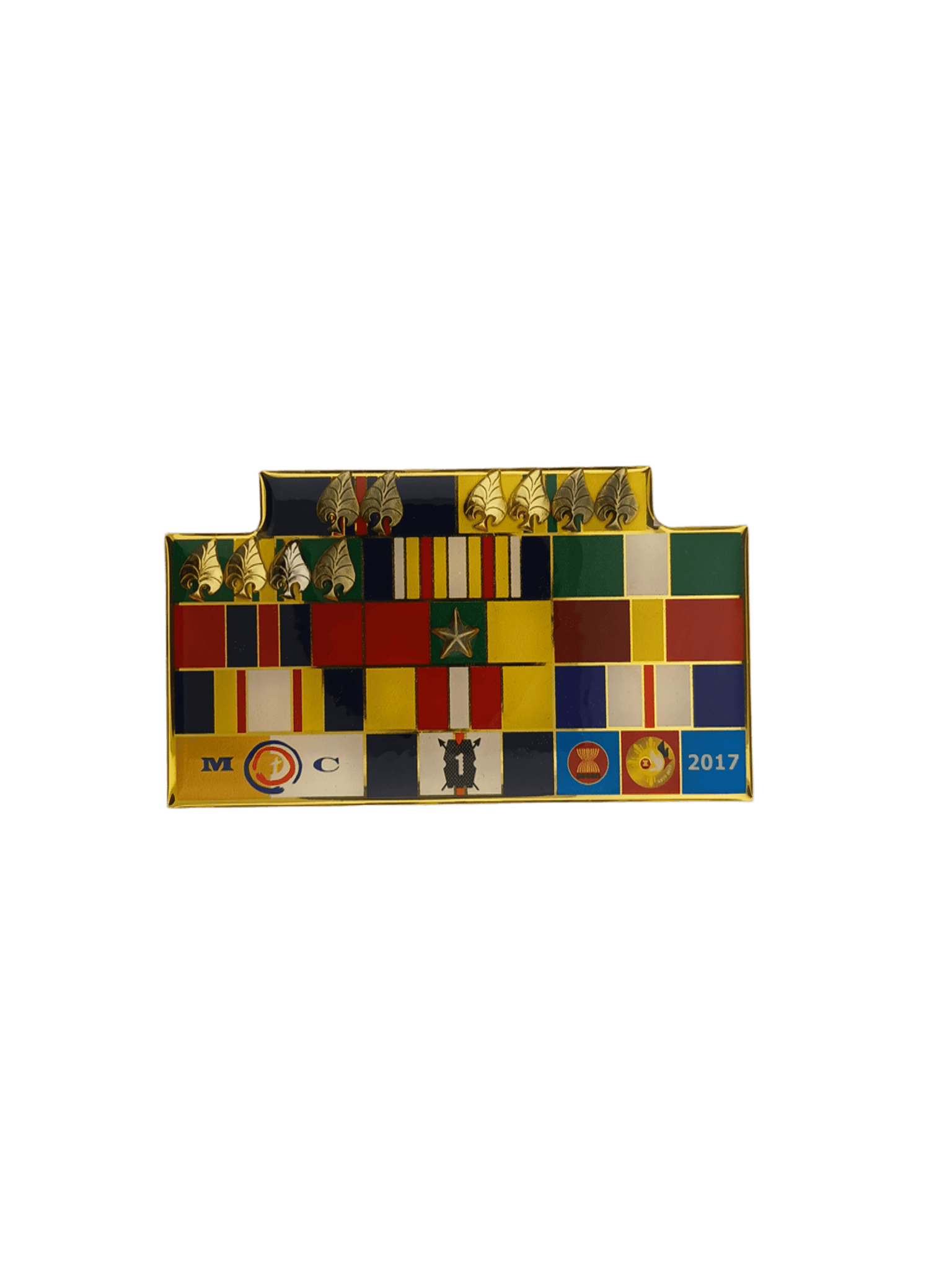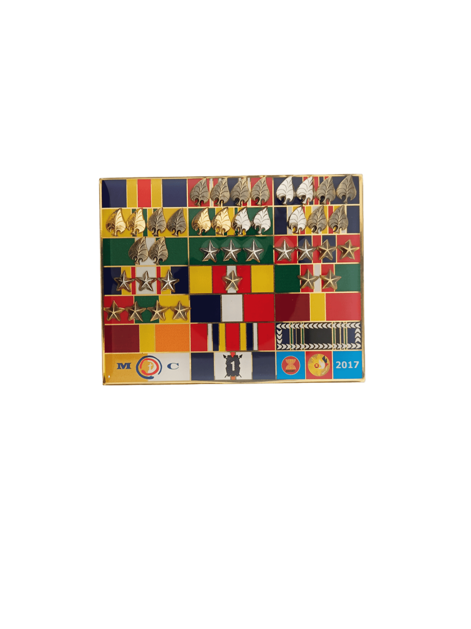 | Personalization Area: | Brass plate (gold finish) showing list of awards or rank titles; colors UV printed on metal base background; embossed attachment elements (bars, insignias) added as needed. |